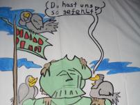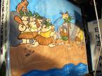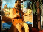 Damit wurde der Ausspruch "von Jägern und Sammlern" selbstironisch aufgenommen und mit den Figuren eines Hönes und von Fred Feuerstein umgesetzt.